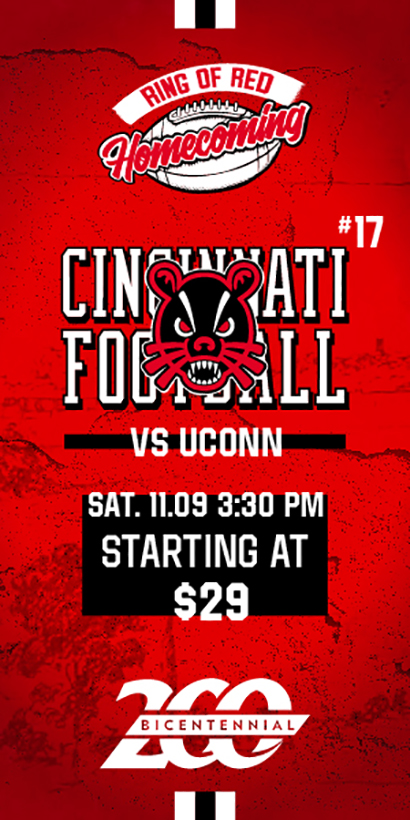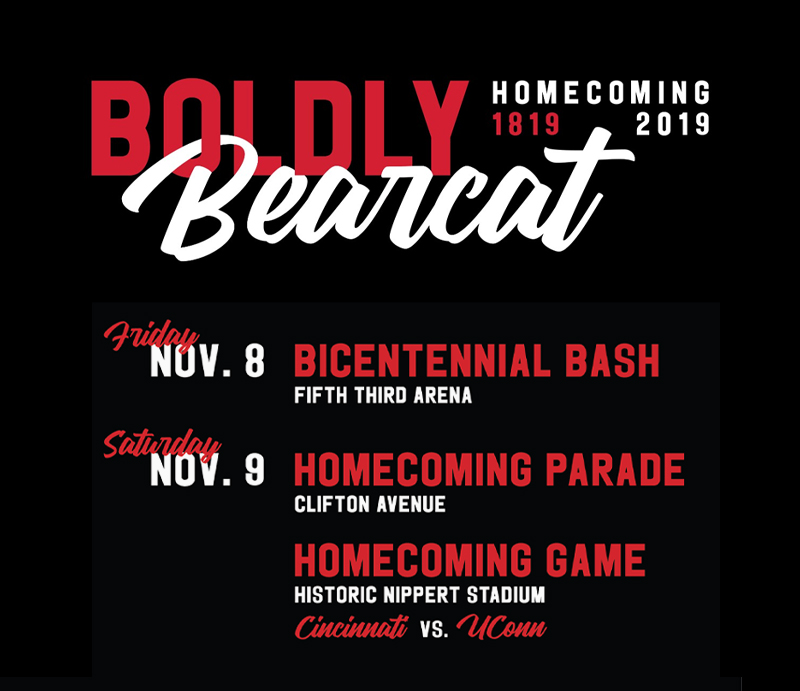 | Find your spot along Clifton Avenue to experience the ultimate “Down the Drive” event, as students, alumni and members of the community show off their best Bearcats spirit! Kevin Youkilis, UC alumnus and World Series champion, will serve as the Bicentennial Homecoming Parade's grand marshal. Food trucks and complimentary swag available. Road Closure Details |